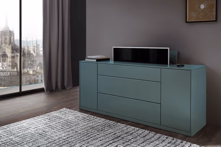Das Fernseh Möbel besitzt einen integrierte Fernseh-Halterung, welcher per Fernbedienung den Fernseh absenkt. So ist der Fernseher im Raum nicht sichtbar wenn dieser versenkt ist.