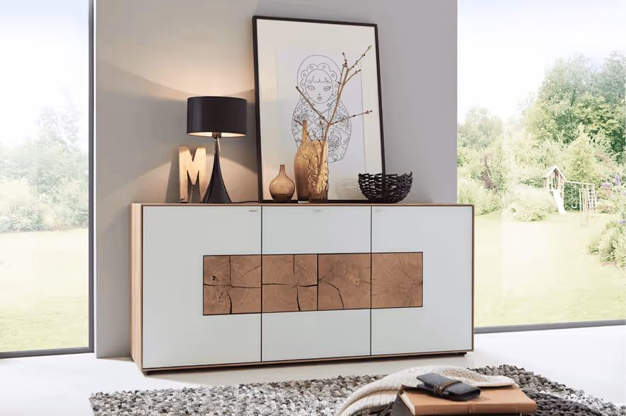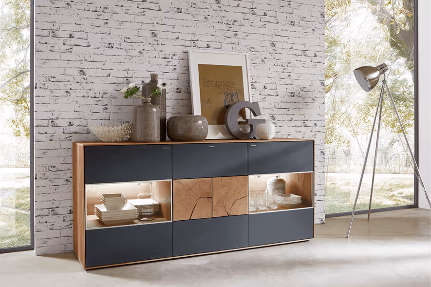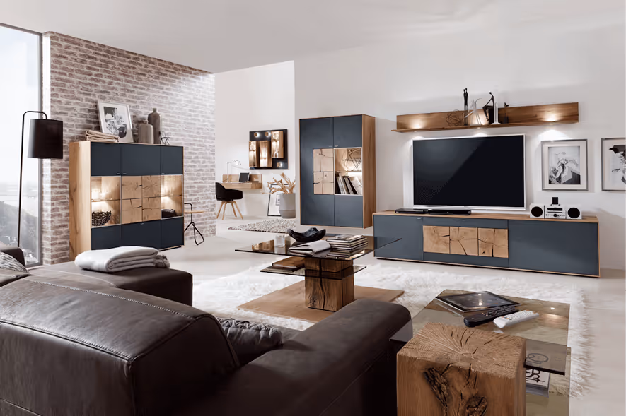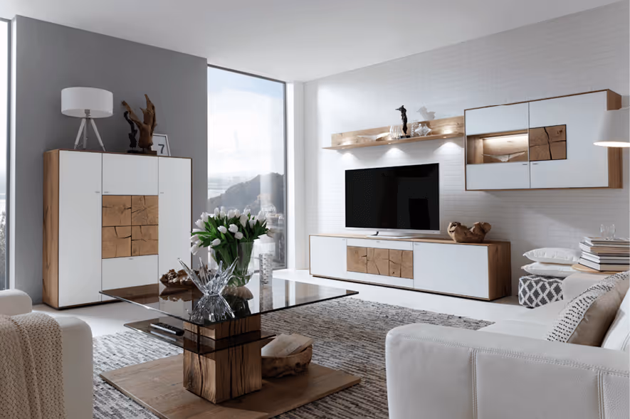 Das Wohnprogramm Hamar zeichnet sich aus durch die Hirnholz-Applikationen. Die Mischung von Glas mit Holz mit den Applikationen gibt dem Programm seinen ausserordentlichen Look. Das zeitlose Programm ist erhältlich in Glas weiss und anthrazit. Stellen Sie ihre eigene Wohnkombination zusammen. Passend dazu gibt es auch ein Tisch- und Stuhlprogramm.