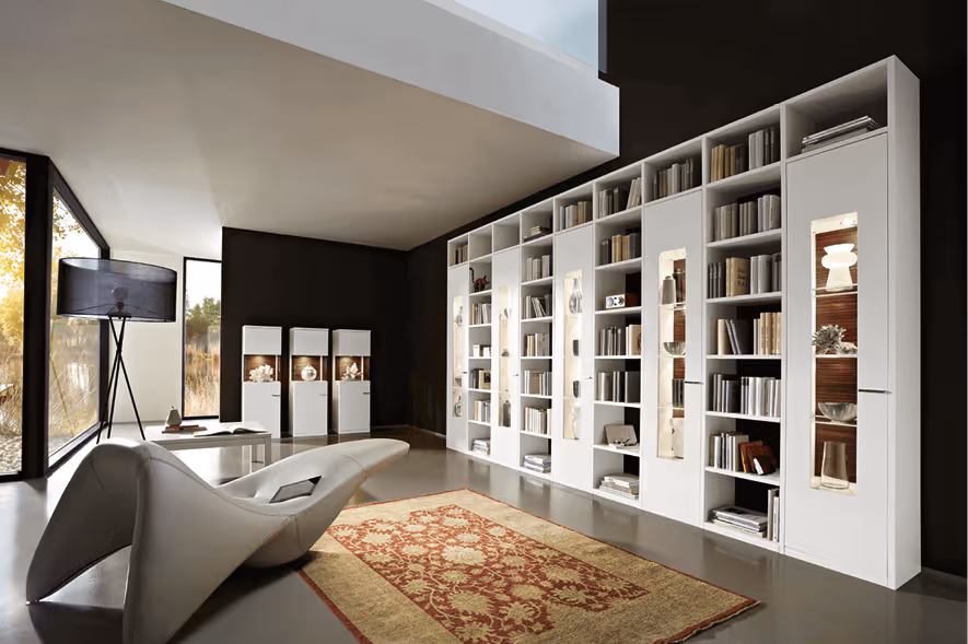 Das Programm Lecce zusammengestellt in Lack weiss, kombiniert mit einem Abedeckblatt sowie Vitirnenrückwand in Eiche