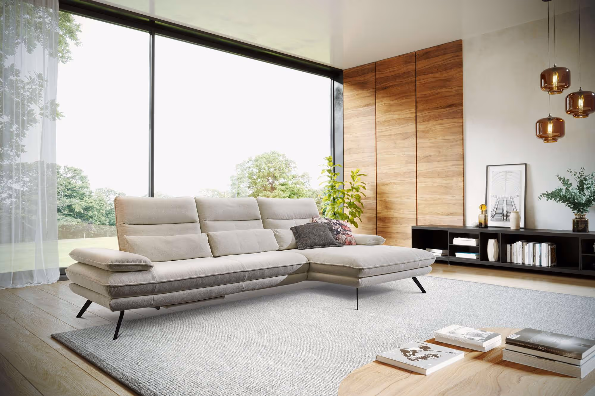 Das Modell ist in Leder und Stoff erhältlich und auch als Eck- oder Longchairgarnitur zusammenstellbar.