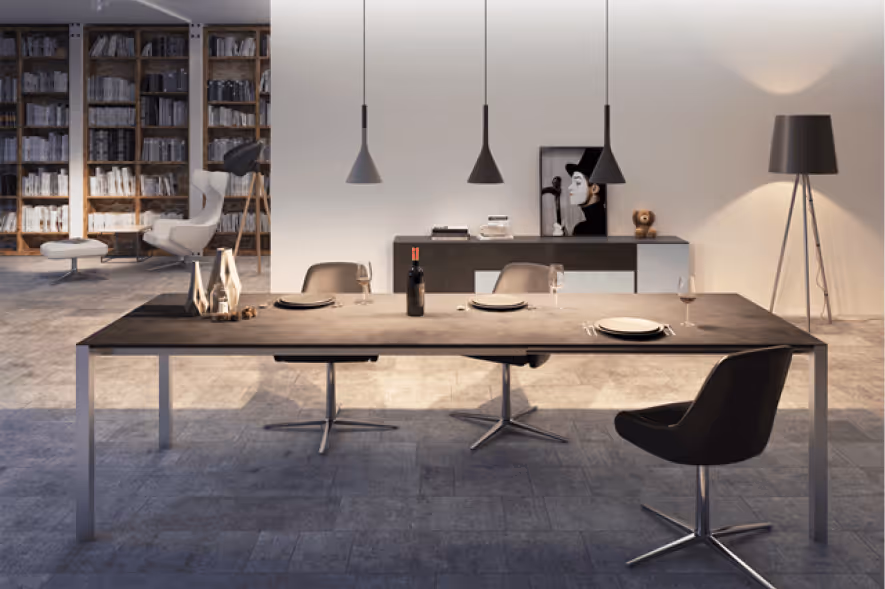 Wählen Sie beim Esstisch Mesiano ob Sie das Untergestell schwarz matt oder in Edelstahloptik bevorzugen. Bei der Tischplatte haben Sie die Wahl zwischen Glas Optiwhite satiniert oder Keramik. Der Tisch ist in verschieden Grundlängen erhältlich sowie mit und ohne Verlängerung.