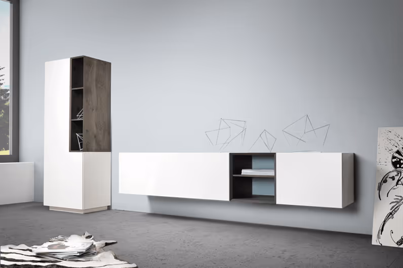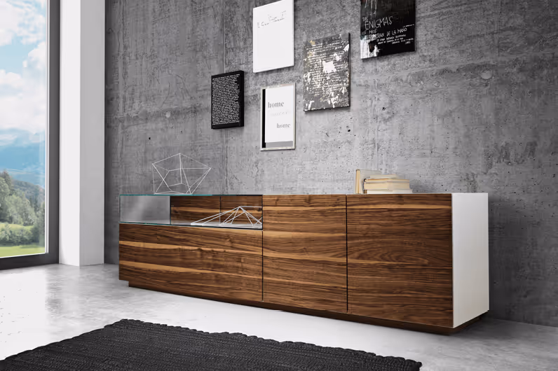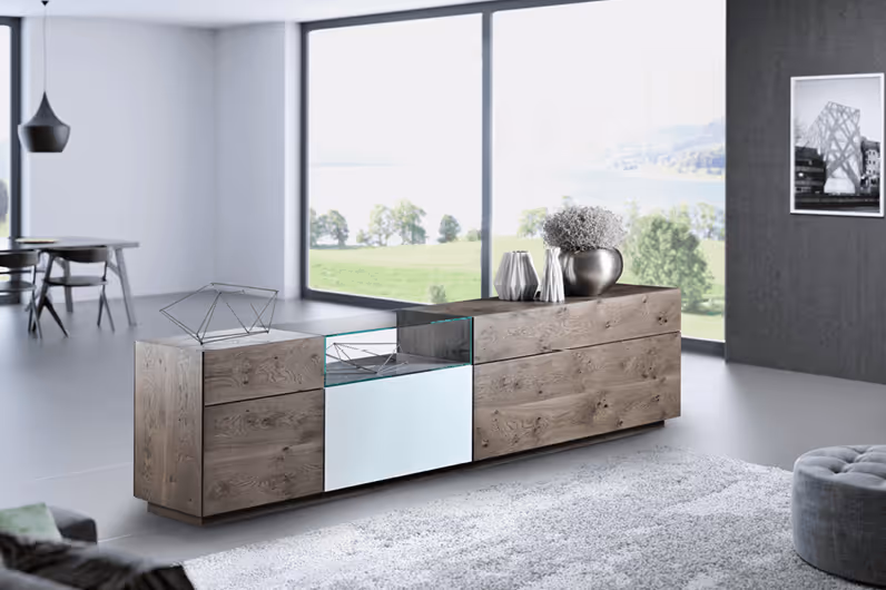 Die Wohnkombination kann nach Lust und Laune zusammengestellt werden. Wählen Sie zwischen verschiedenen Lack- und Glasfarben und Hölzern und stellen Sie ihr passendes Wohnprogramm oder Sideboard zusammen.