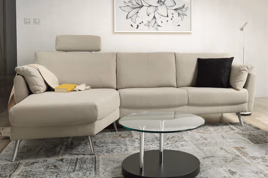 Die filigrane Garnitur Veria ist in Stoff und Leder erhältlich. Ob Einzel, Eck- oder Longchairkombination - es ist alles möglich.